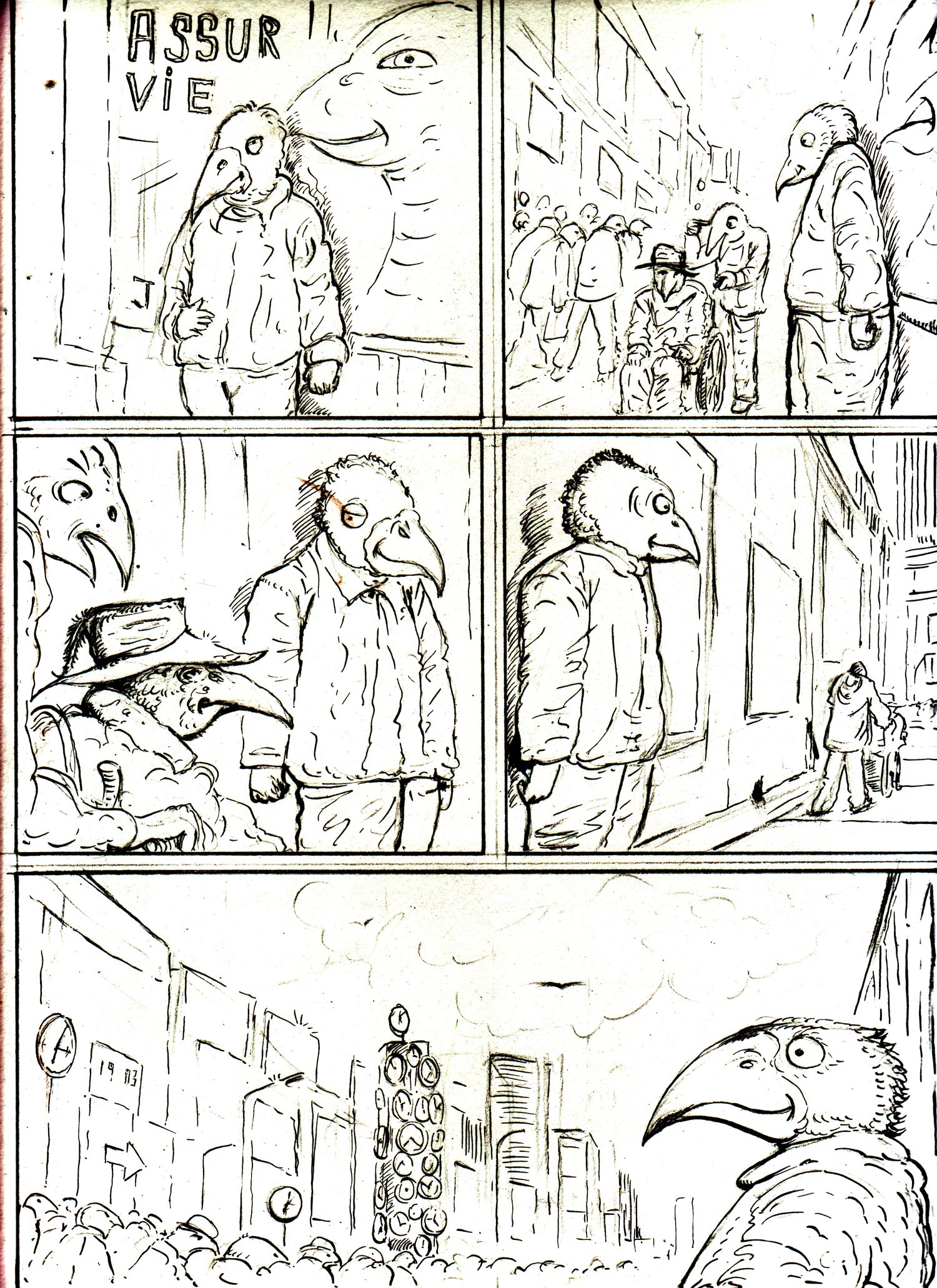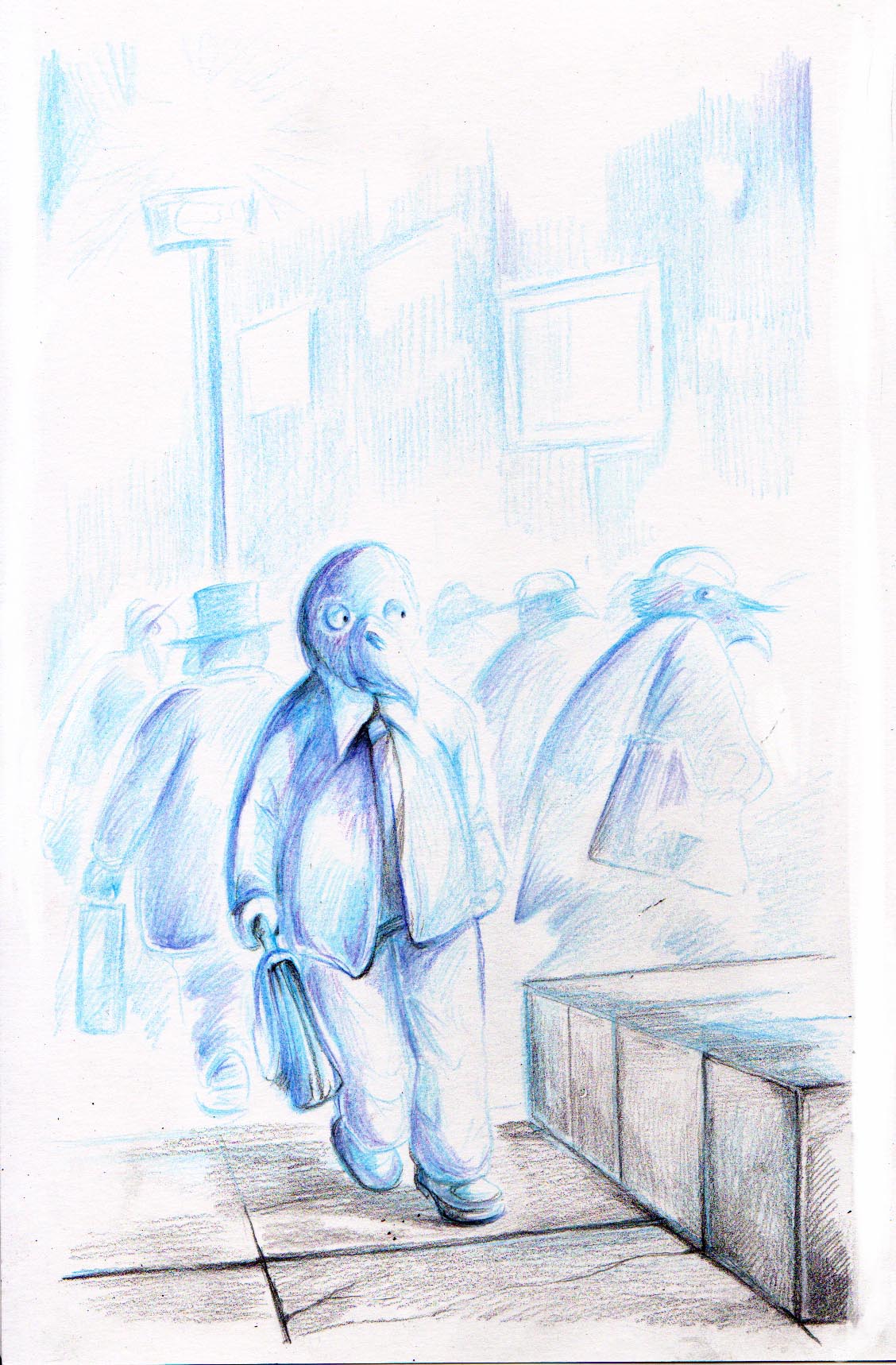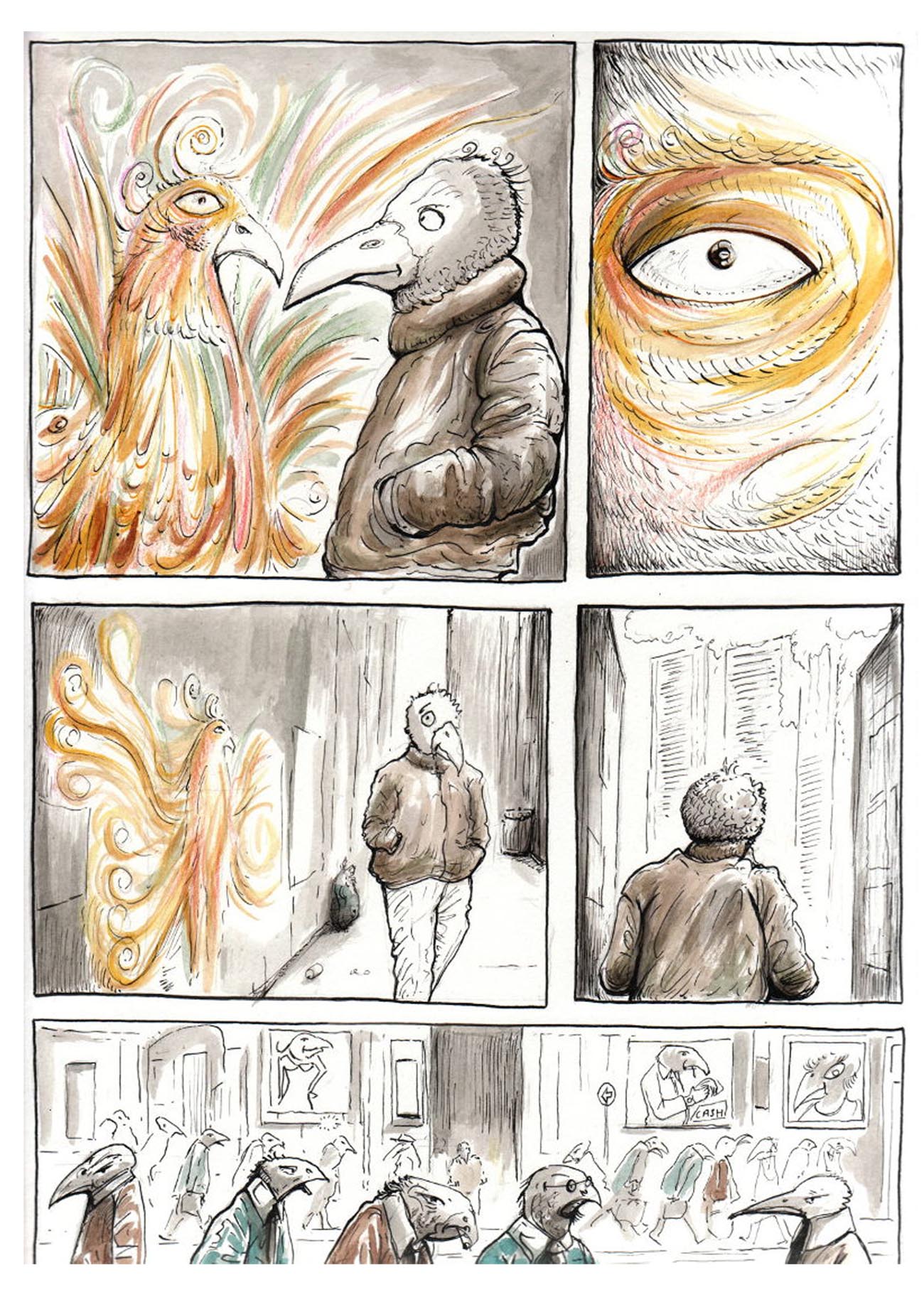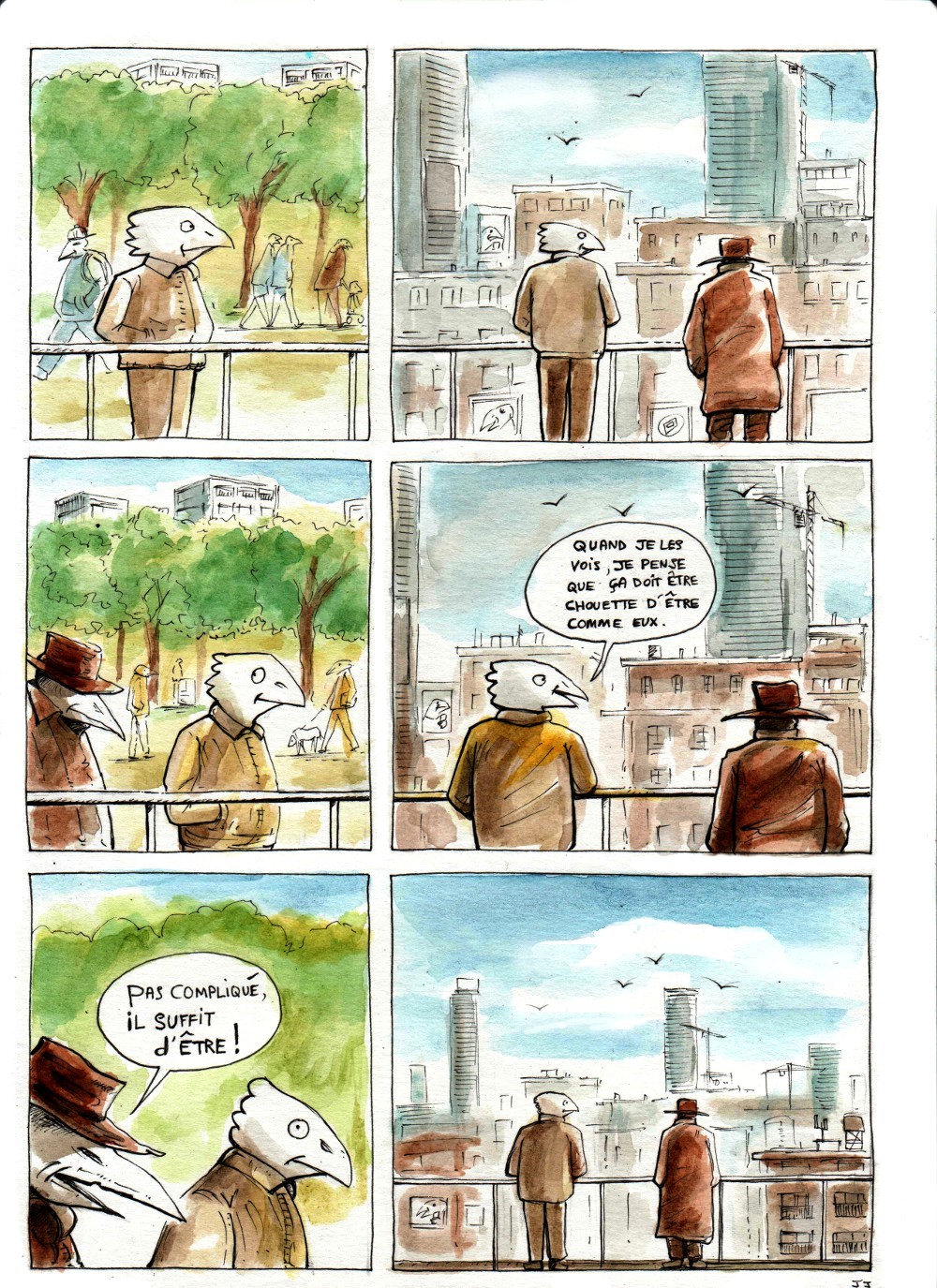 Dans une ville, de hauts bâtiments, de grandes rues, une effervescence se déroule. Les habitants s'affairent, courent, rattrapant le temps ou essayant de le devancer: ce sont des oiseaux! Mais des oiseaux qui ont oublié leur nature propre... | ![]() |