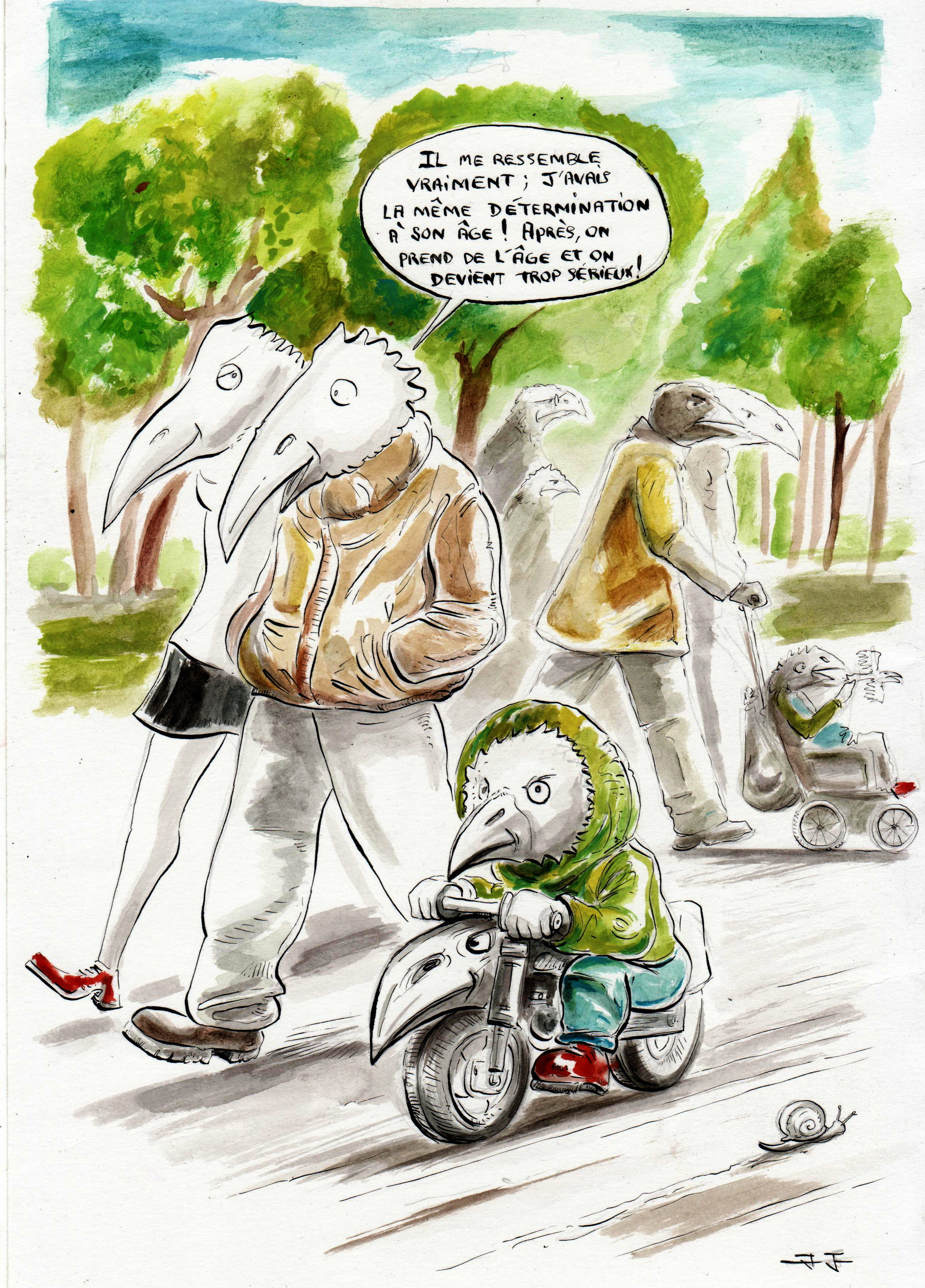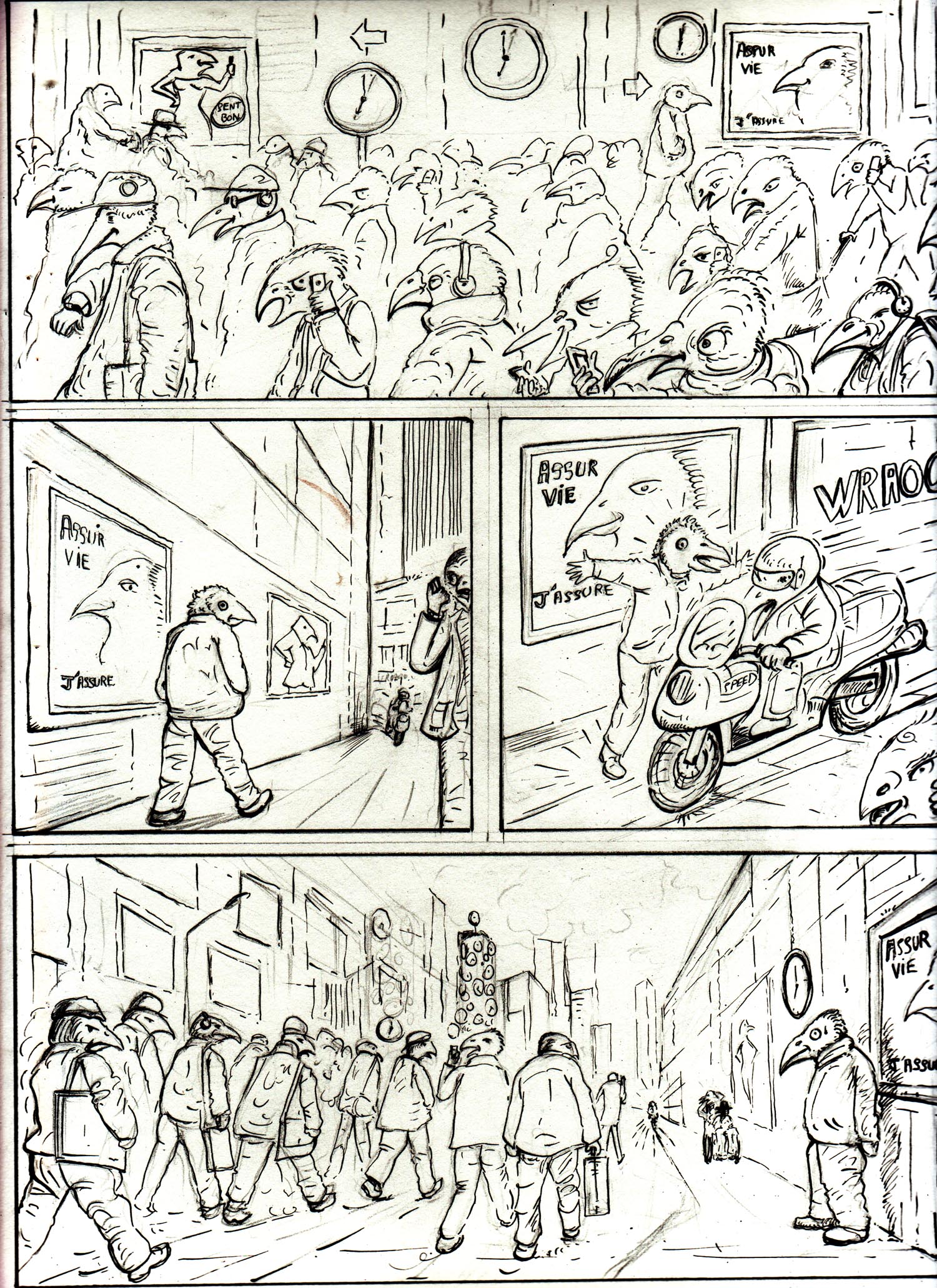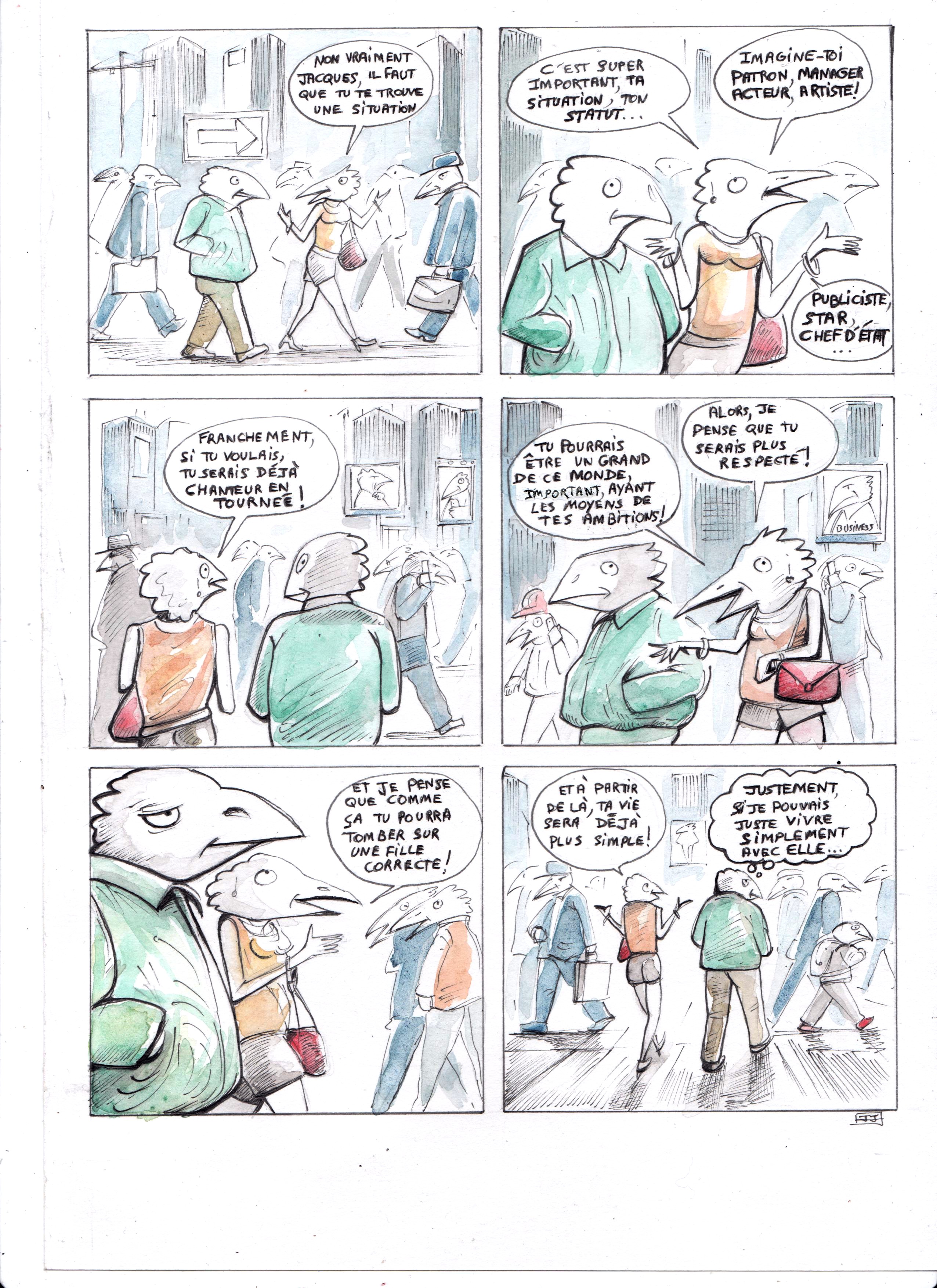 Dans une ville, de hauts bâtiments, de grandes rues, une effervescence se déroule. Les habitants s'affairent, courent, rattrapant le temps ou essayant de le devancer: ce sont des oiseaux! Mais des oiseaux qui ont oublié leur nature propre... | ![]() |