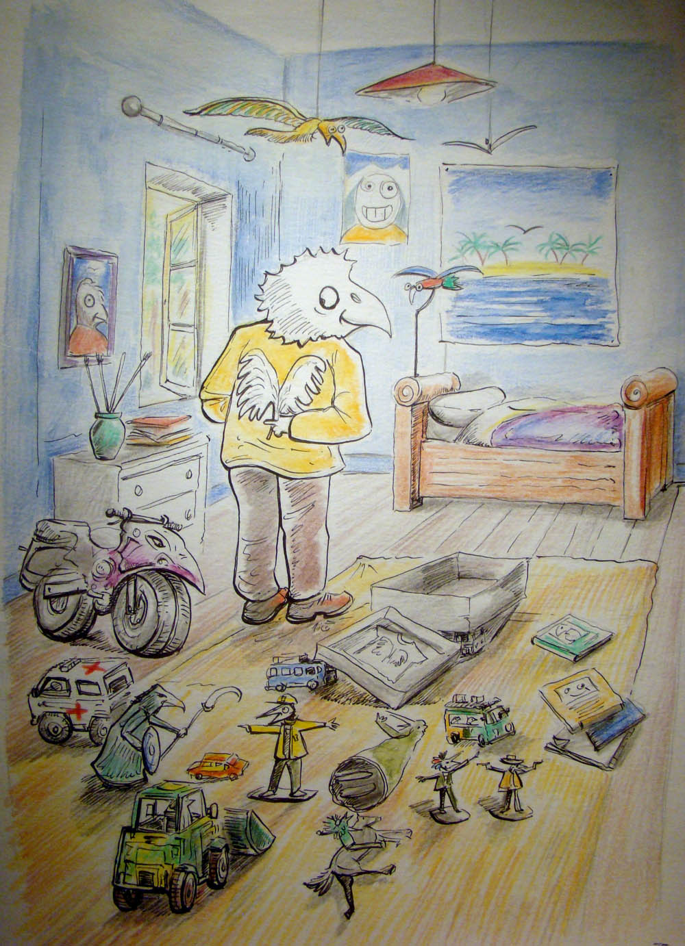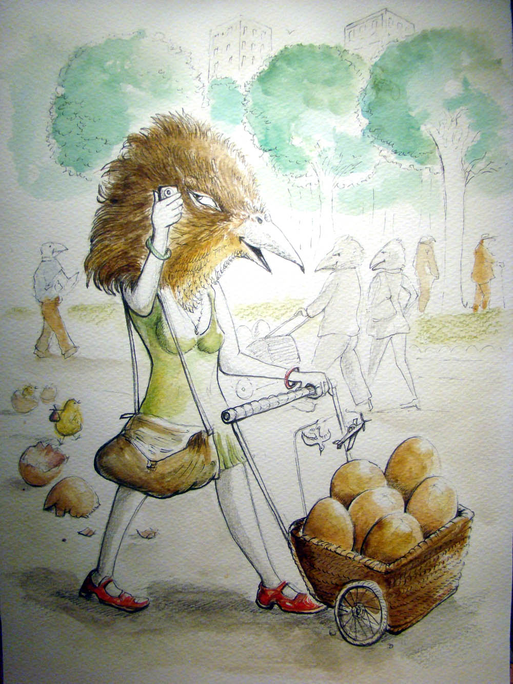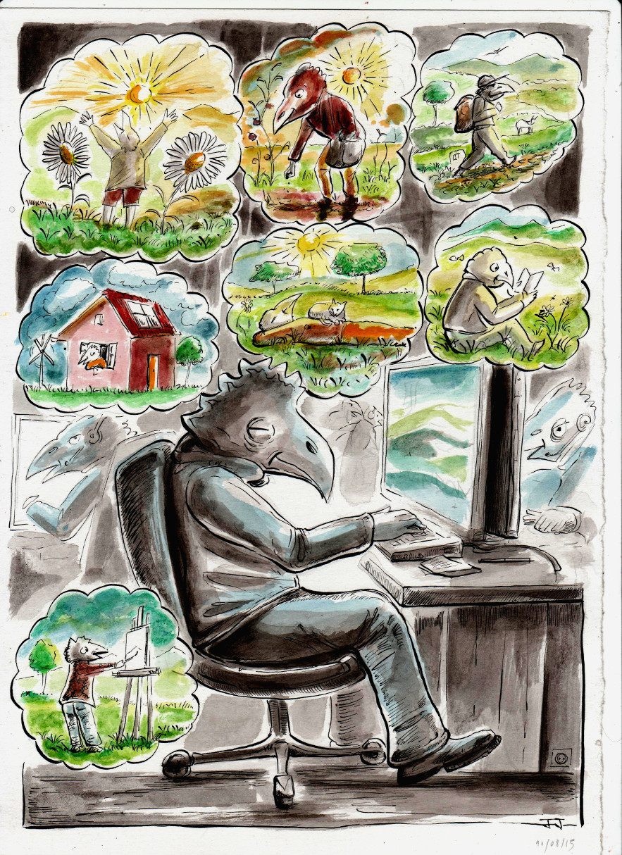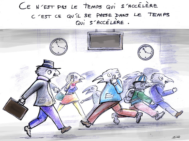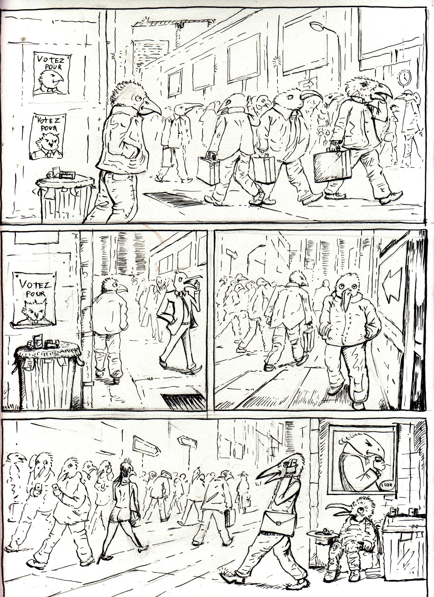 Dans une ville, de hauts bâtiments, de grandes rues, une effervescence se déroule. Les habitants s'affairent, courent, rattrapant le temps ou essayant de le devancer: ce sont des oiseaux! Mais des oiseaux qui ont oublié leur nature propre... | ![]() |
